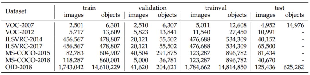 建立具有更少的偏置的更大的数据集,是开发先进的计算机视觉算法的关键。在目标检测方面,在过去10年中,已经发布了许多著名的数据集和基准测试,包括PASCAL VOC挑战的数据集(例如,VOC2007, VOC2012)、ImageNet大尺度视觉识别挑战(例如,ILSVRC2014)、MS-COCO检测挑战等。下表1给出了这些数据集的统计数据。