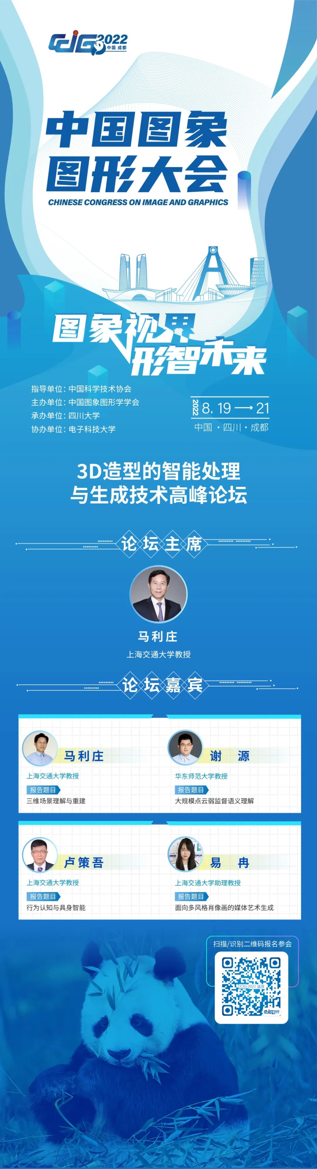中国图象图形大会(CCIG 2022)将于2022年8月19-21日在成都盛大举办,大会以“图象视界,形智未来”为主题,由中国科学技术协会作为指导单位、中国图象图形学学会主办、四川大学承办、电子科技大学协办。