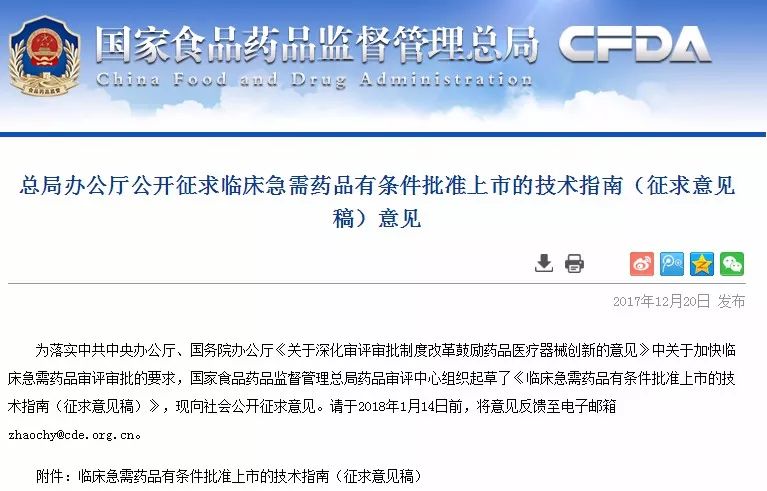 昨日(12月20日),CFDA就《临床急需药品有条件批准上市的技术指南(征求意见稿)》(以下简称征求意见稿)向社会公开征求意见,征求时间截止到2018年1月14日。