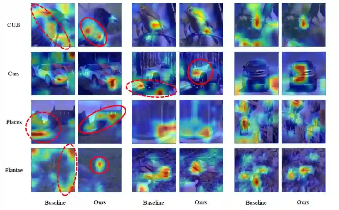 可以发现只在mini-Imagenet上训练的模型会对更加接近mini-Imagenet的东西感兴趣,例如树枝/山/背景等,但是会忽略真正对识别target classes有用的区域。而我们的方法在auxiliary data的帮助下能成功关注到那些关键的区域。