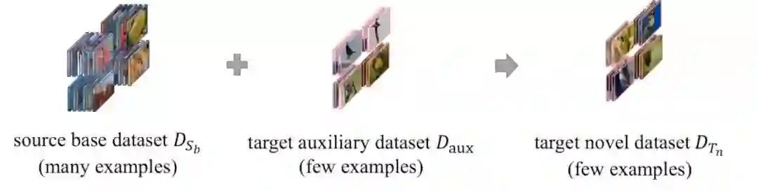 在我们的setting下,我们将未曾被利用起来的target base 做为来自target domain的额外数据,来引导模型的学习。具体而言,对于每个 中的类别,我们随机采样 个样本 (最终方法中, ),这些样本共同构成我们的auxiliary data 。