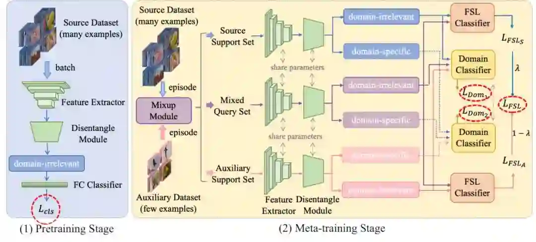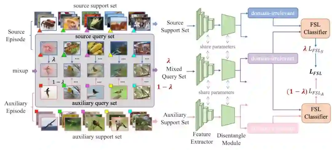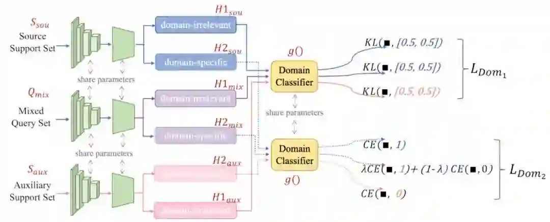 3) 对source support set, auxiliary support set,以及mixed query set这三路都各自依次送入feature extractor以及disentangle module中,获取各自的domain-irrelevant features, domain-specific features;