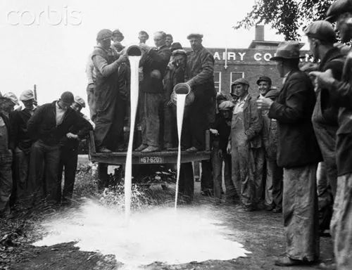 牛奶罢工的起因当然是大萧条导致的农产品需求下降,牛奶价格下跌——大萧条前的1927年美国鲜奶的价格为 4.79 美元每一百磅,其中奶农能分到销售收入46%。