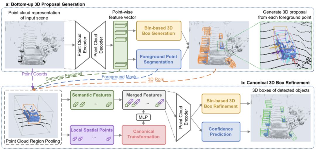 作者观察到自动驾驶场景中物体在3D空间中是自然分离的,从而可以直接从3D框的标注信息中得到点云的语义分割标注。因此本文提出了以自底向上的方式直接从原始点云数据中同步进行前景点分割和3D初始框生成的网络结构,即从每个前景点去生成一个对应的3D初始框(阶段一),从而避免了在3D空间中放置大量候选框。