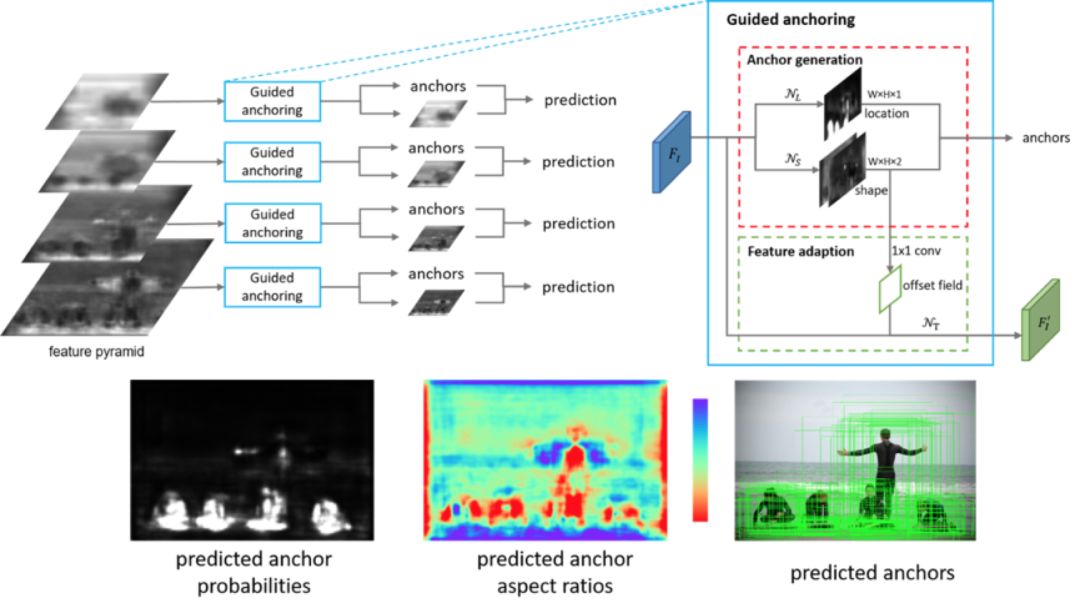 本文反思了这一关键步骤,提出了一种基于特征指导的动态锚点框生成算法,该算法利用语义特征来指导锚点框生成的过程,具有高效率和高质量的特点。本算法可以同时预测目标物体中心区域和该区域应产生的锚点框的大小和长宽比,以及根据锚点框的形状来调整特征,使特征与锚点框相吻合,从而产生极高质量的动态锚点框。