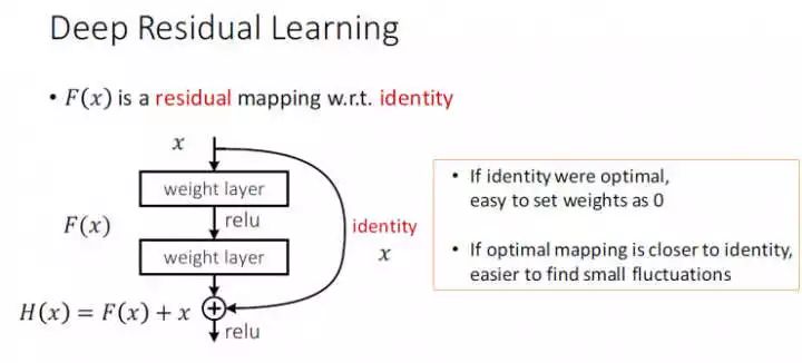 也就是说,如果identity是最优的,它就是我们想要的理想映射,那么我们可以直接将F(x)的参数全部置零;如果identity和H(x)很相近,那么我们就可以通过学习残差来修正这种差别。这个箭头称作shortcut connection,idea来自于highway network的skip-connection。