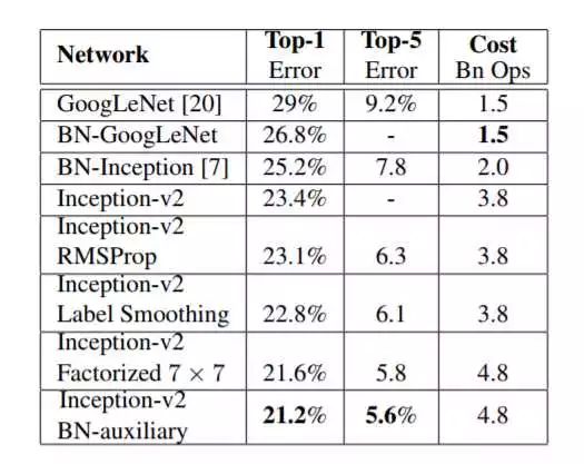 Inception-v2是最原汁原味的版本,下面的Inception-v2 RMSProp、Inception-v2 Label Smoothing、Inception-v2 Factorized7x7、Inception-v2 BN-auxiliary是经过了一系列改进后的结果,具体操作请参考论文。