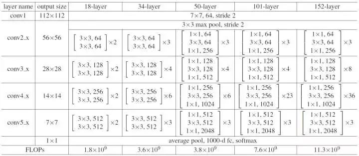 ResNet可以逐渐加深,常用的有ResNet-50、ResNet-101、ResNet-152。像ResNet-1001这么庞大的model一般的GPU难以加载。这些模型的参数如图: