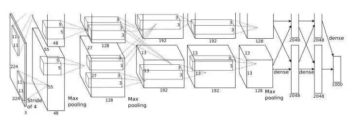 网络一共有8层可学习层——5层卷积层和3层全链接层。网络的输入为150,528(224x224x3)维,各层的神经元数量为: