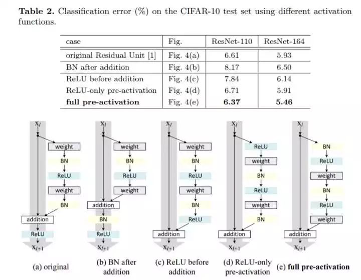 因为之前提到的没有shorcut connection的网络里,考虑activation的位置没有什么意义。但是在有分支的残差网络里,因为存在着addition,那么和identity相加的值应该是激活前还是激活后的就值得考虑。这里比较了各种残差单元的优劣,也就是说,将identity先进行BN,再激活,再传入weight layer进行计算的效果是最优的。