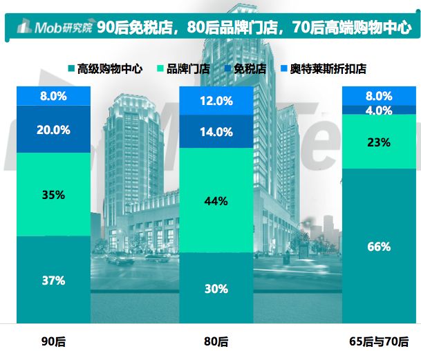 线下渠道主要包括高级购物中心、品牌门店、免税店以及奥特莱斯折扣店等,65 后与70后更多选择在高级购物中心消费,90后则会多渠道选择,青睐免税店