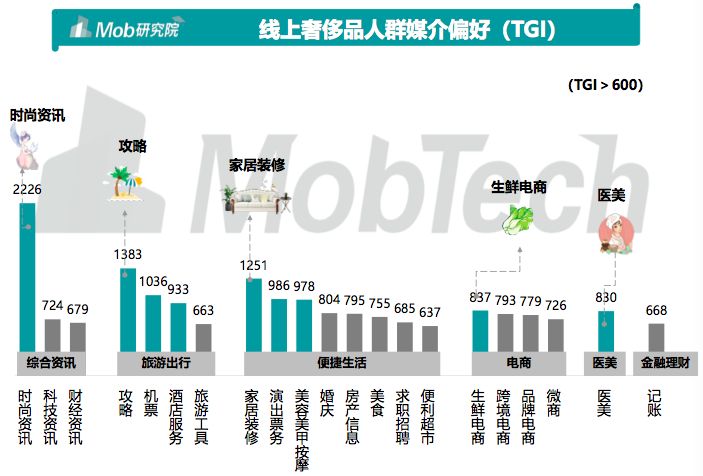 奢侈品消费者更关注综合资讯、旅游出行、便捷生活、电商、医美等移动媒介App,尤其在综合资讯类、攻略类、机票类、家居装修类、生鲜电商类表现的较 为明显