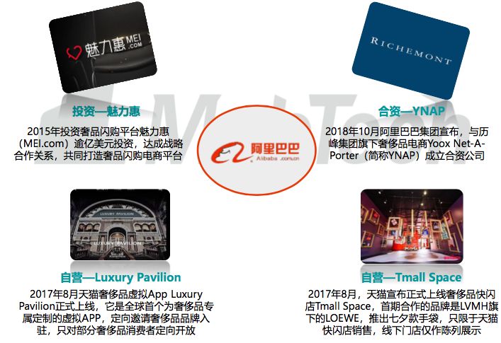 除了引入奢侈品各大品牌开设天猫旗舰店以外,近年来在天猫商城推出内置奢侈 品平台Luxury Pavilion和快闪店Tmall Space,投资魅力惠,与历峰集团旗下奢 侈品电商YNAP成立合资公司。