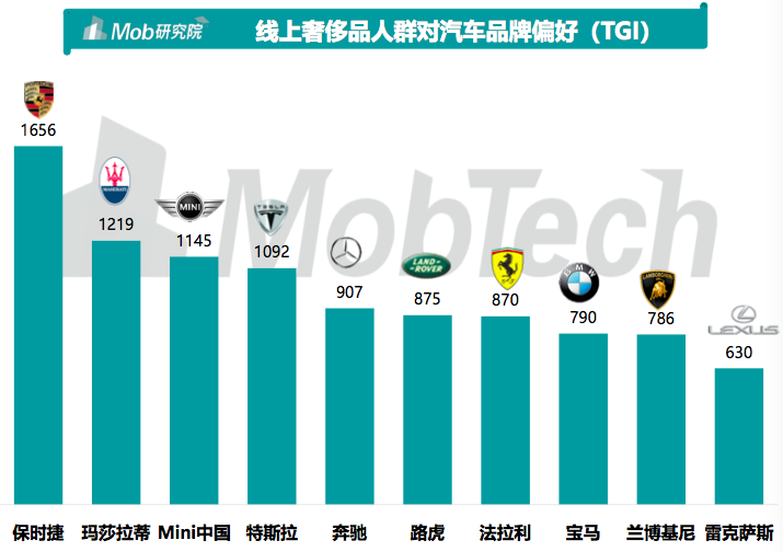 奢侈品人群更加关注高端车、豪华车品牌,在兴趣偏好上保时捷、玛莎拉蒂、Mini中国、特斯拉等品牌关注比例最高