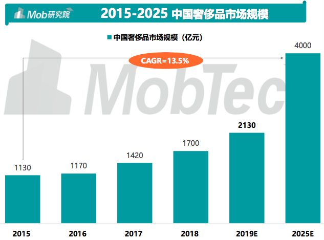 2019年中国奢侈品市场规模(不包含海外消费)预计突破2000亿人民币,达到 2130亿元,随着新生代的崛起和国民消费水平提升,2025年预计突破4000亿。