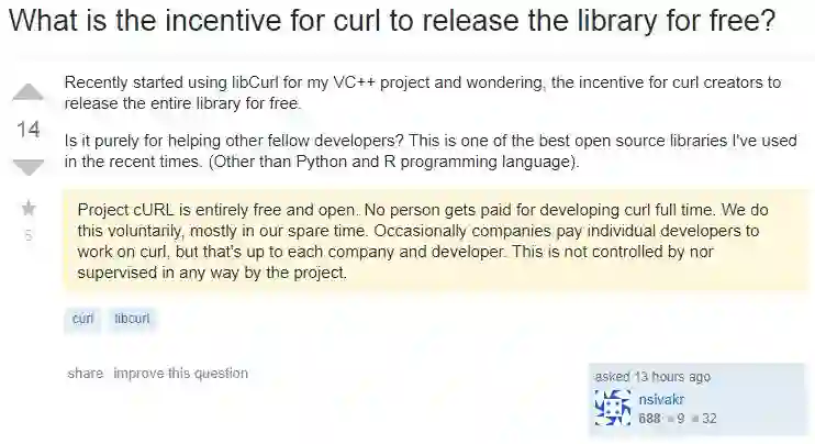笔者今日在浏览 Stack Overflow 的时候,看到有开发者发表了一个这样的问题 —— “What is the incentive for curl to release the library for free?”,大意是想知道 curl 作者为什么会选择将其开源并且免费提供。