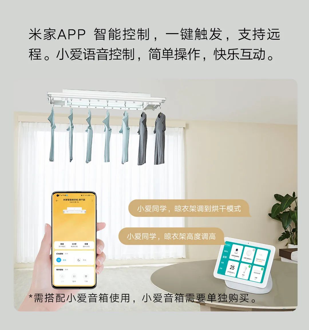 米家智能晾衣机烘干款支持通过米家 APP 设置智能家居联动,洗衣机洗好衣物后,米家智能晾衣机会自动下降晾衣机,方便用户晾晒衣物,此外还可通过小爱同学语音打开晾衣机的照明和烘干功能。