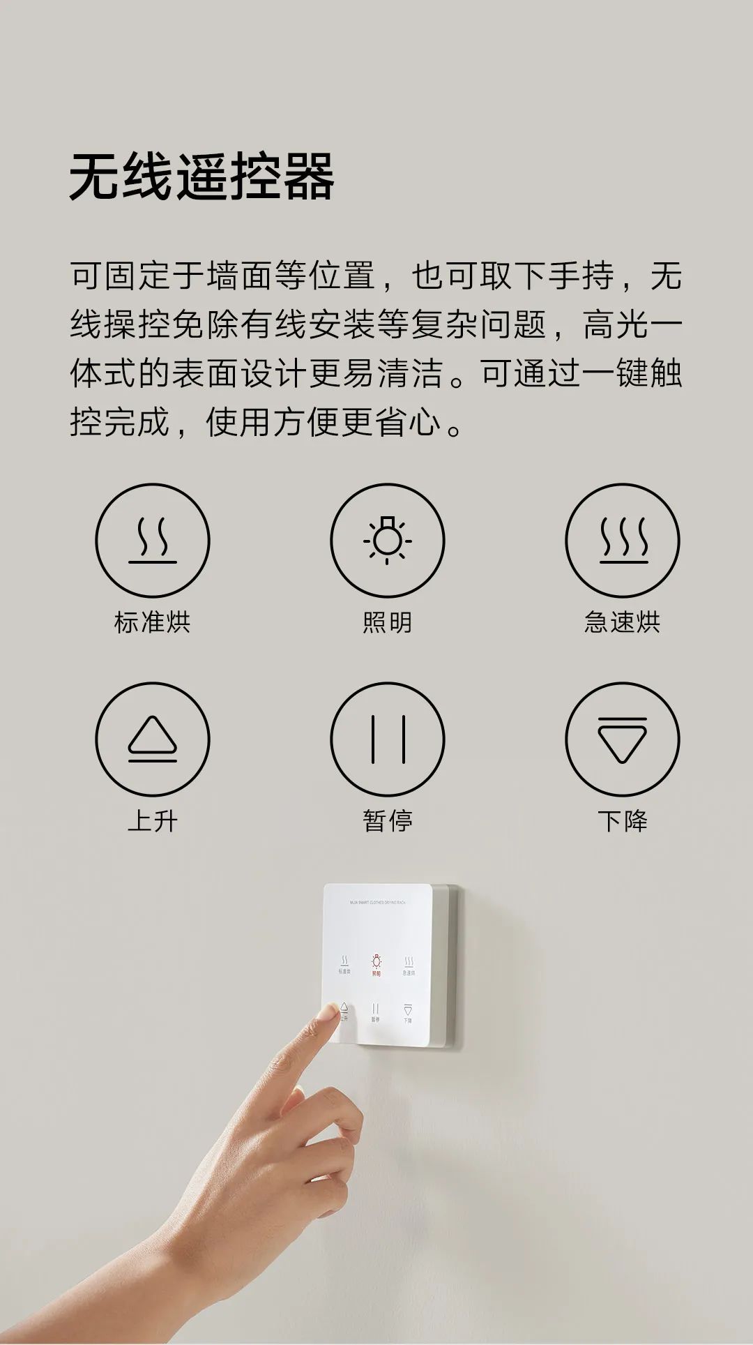 此外,米家智能晾衣机烘干款还配备无线遥控器,可固定在阳台墙面或直接手持操作,一键触控完成日常操作,使用方便更省心。