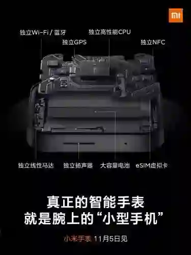 11月3日,小米品牌CEO雷军透露,小米将于11月5日发布一款智能手表,官方给它的定位是腕上“小型手机”。