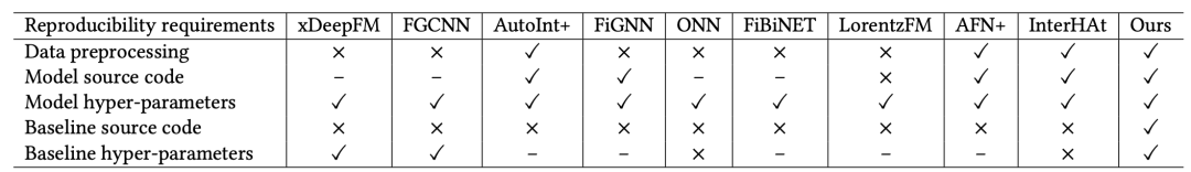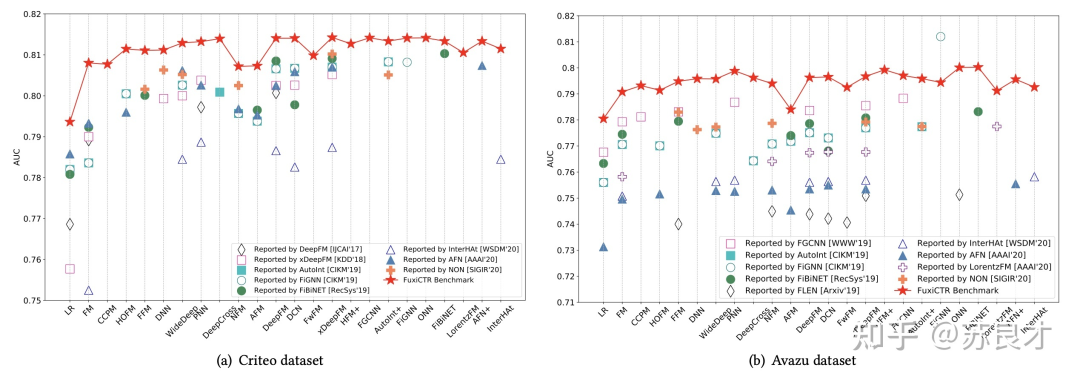 我们身处在一个很好的时代,能够遇到一些很优秀的推荐系统开源代码库。其中,FuxiCTR不仅指出了CTR预估模型发展的一些问题,包括基线效果不一致、数据划分不统一、调参不细致等,而且进行了真正的大量实验(超过12,000 GPU时)给出了近年来主流CTR模型的复现结果。当然,令人眼前一亮的是,复现的结果甚至相比于论文结果有着明显的提升。如图1所示,FuxiCTR汇报的结果相比于论文汇报结果能够有千分点甚至百分点的提升。顺便一提,FuxiCTR的论文今年也被CIKM 2021接收。从这个角度看,FuxiCTR就是本文要寻找的“巨人的肩膀”。