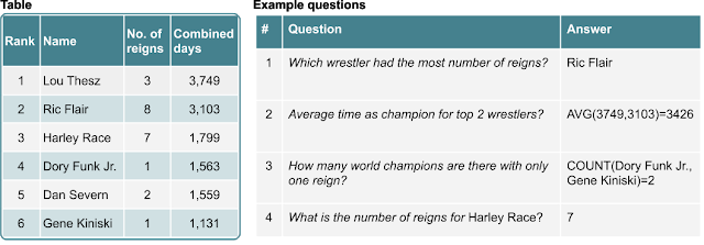 例如,下图展示了一个表格以及人们可能会询问的一些问题。这些问题的答案能在表格的一个或多个单元格内找到(“哪位摔跤手卫冕次数最多?”),或者需要结合多个单元格计算得出(“有多少世界冠军仅卫冕过一次?”)。