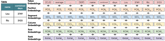 同时,利用基于 Transformer 的 BERT 模型,对关键信息添加的额外嵌入向量可用于对结构化输入进行编码。我们依靠已习得的嵌入向量编码列索引、行索引,以及一个表示数字列中元素排序的特殊排名进行索引。下方图片显示了以上所有内容如何一并在输入端完成添加并返回给 Transformer 层。下方图表通过左侧表格说明问题的编码方式。每个单元格的 token 都有一个特殊的嵌入向量,以指明其所在的行、列,以及列中的数字排名。