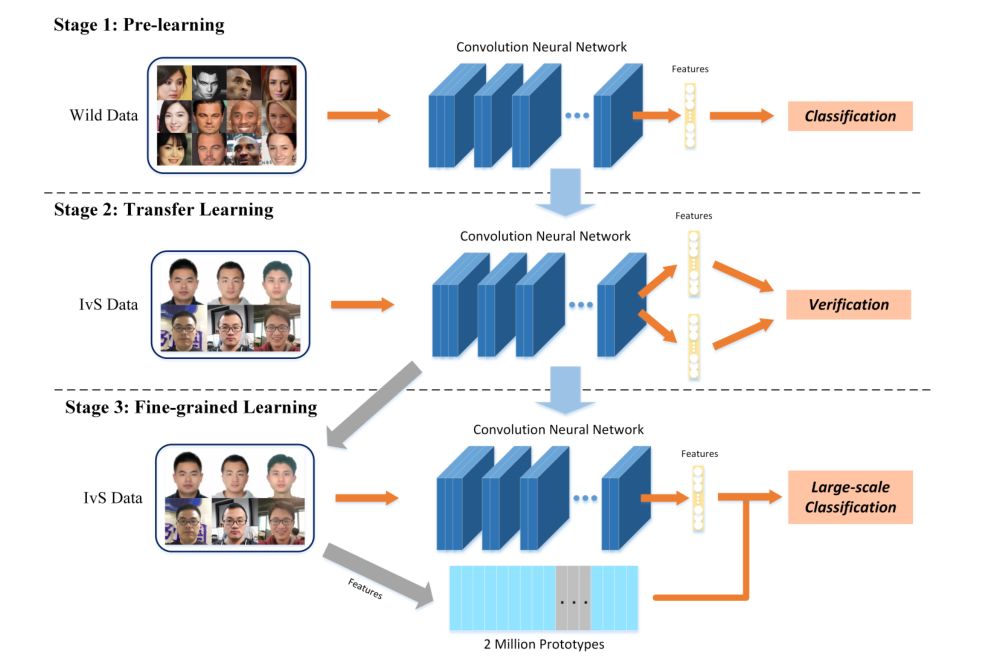 我们提出的大规模双样本学习方法包括两个方面,一是提出了一种分类-验证-分类(CVC)的训练策略来逐步提高实际场景中的性能,二是针对大规模分类问题提出了DP-softmax使得深度学习在超大规模类别的分类上具有可扩展性。