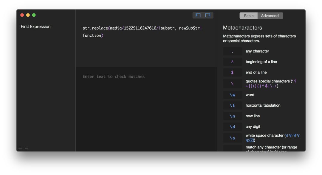 Expressions 是一款简洁轻量的正则表达式调试工具,只需要直接输入规则和测试文本,你就能实时预览匹配结果。如果你记不清具体规则,也可以通过 Expressions 的语法参照表随时巩固学习。此外,你也可以设置多个规则分组,方便随时使用。