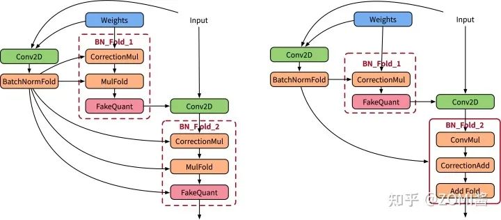 图中主要注意的点为BN_Fold_1和BN_Fold_2,其中BN_Fold_1的作用有两个:拆分融合的BN层对weight的影响,和对权重数据进行校正;BN_Fold_2的作用有两个:拆分融合的BN层对bias的作用影响,和对bias数据进行校正。