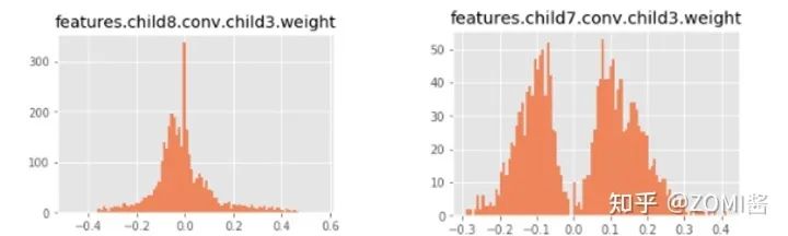 前面呢,曾经提到一般而言,权重数据是对称,为了可以进一步减少数据的计算,较少额外的存储数据,因此推荐使用对称的量化算法。但是在对mobieNetV2,mobileNetV3的实际测试开发的过程中,发现数据大部分是有偏的,例如mobileNetV2中: