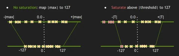 确定了scale之后,itn8数据对应的表示范围为 ,量化操作即为对待量化数据以 进行饱和式截断,即超过范围的数据饱和到边界值,然后进行第一条公式所示量化计算即可。