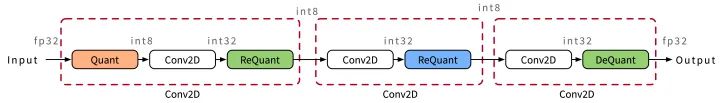 c3项可以在离线时计算好,作为新的bias参数传入。c1和c2项需要在线计算。Conv2d的INT8计算根据输入是float32还是int8决定是否需要插入Quantize OP,根据输出是float32还是int8决定输出是插入Dequantize OP还是Requantize OP。