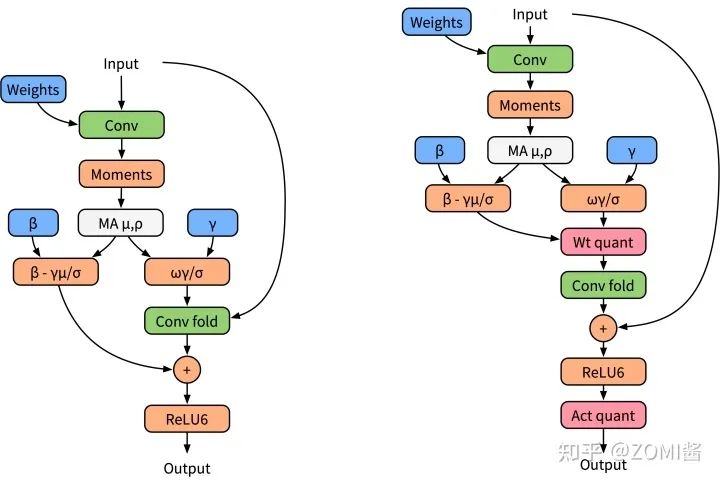下面图中左边是BN折叠的BN folding训练模型,右边是BN folding感知量化训练模型。