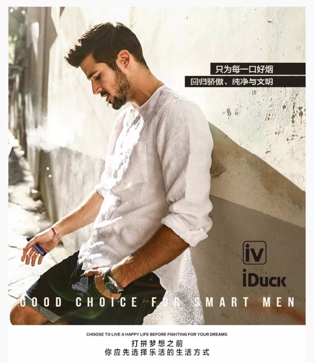 iDuck强化吸电子烟是「乐活」、「文明」、「聪明男人的选择」,将吸烟的危害弱化于无形——