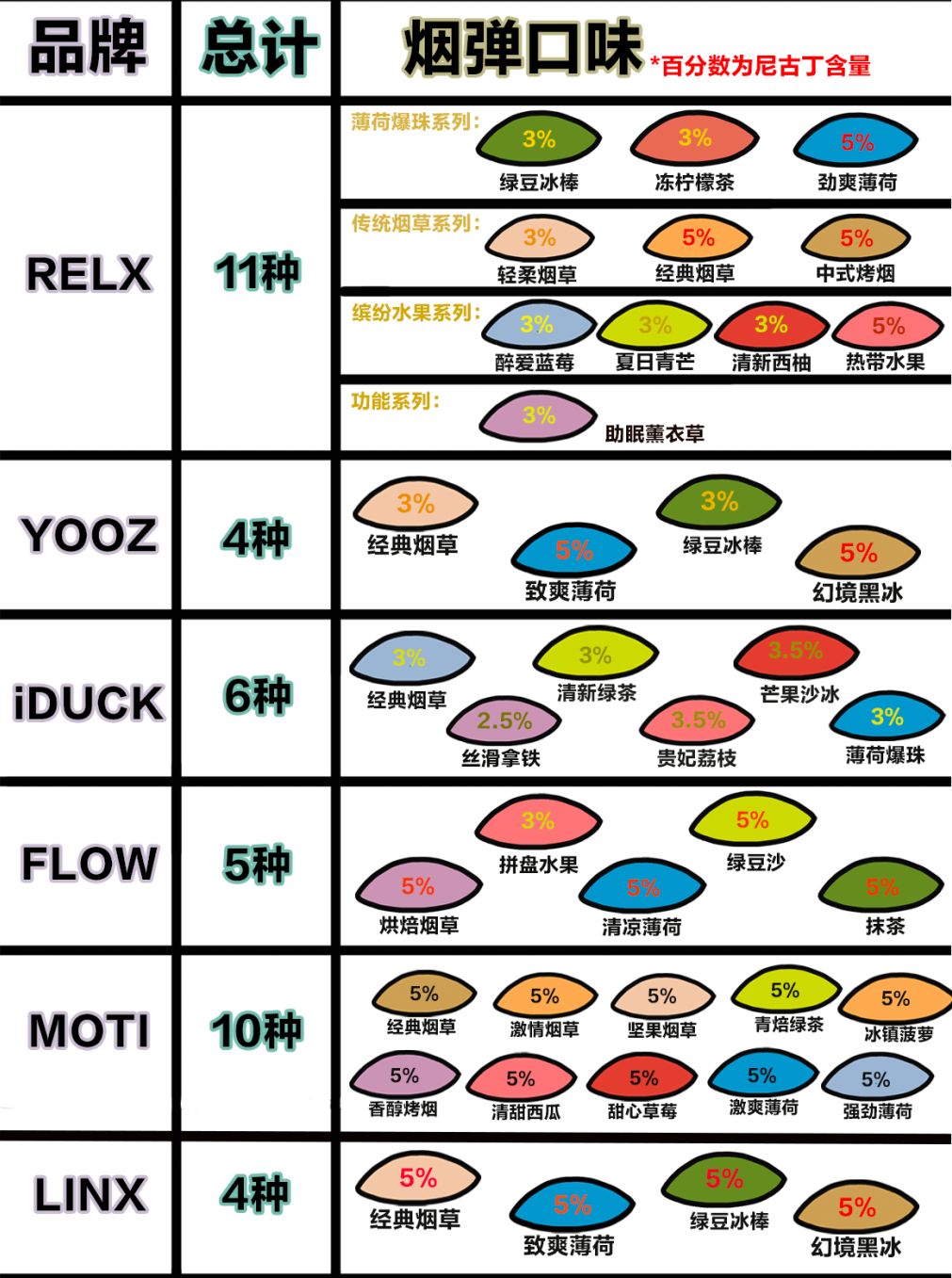 即便没有一般香烟中最致命的一氧化碳和焦油,但从图表中可以看出,每种口味的烟弹,都含有致人上瘾的尼古丁。