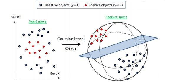 ,高斯核实际上具有相当高的灵活性,也是使用最广泛的核函数之一。下图所示的例子便是把低维线性不可分的数据通过高斯核函数映射到了高维空间: