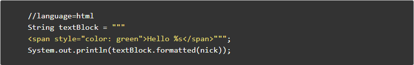 text block 还有一个小特性就是基本的模板特性支持,你在text block中要引入一些上下文变量,直接 %s ,然后调用 formatted 方法就可以啦。