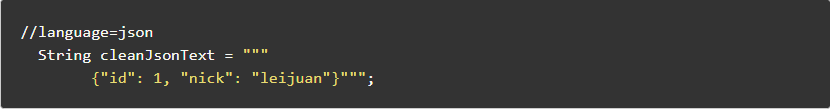 简单多啦,你可以自由写代码,不用担心各种双引号转换的问题,copy分享转换等。稍等,你为何要在 cleanJsonText 前面添加 //language=json ,这个什么鬼?这个是 IntelliJ IDEA 的一个特性,你的 text block 还是有语义的,如是一段HMTL、JSON、SQL 等,添加这个后,马上就代码提示啦。一般人我不告诉他 :)