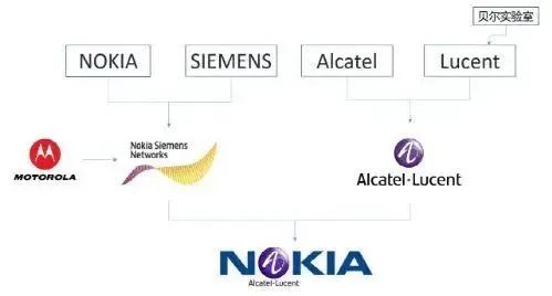 在手机业务如日中天的时候,诺基亚曾将电信设备业务与西门子合并成立了“诺西公司”。在失去手机后,诺基亚开始了电信部门的重建。2013年,诺基亚购买了西门子持有的诺西公司的另一半股份。2015年,诺基亚又用156亿欧元收购了电信巨头阿尔卡特-朗讯公司,从而将通信业界拥有至高地位的贝尔实验室收入囊中。