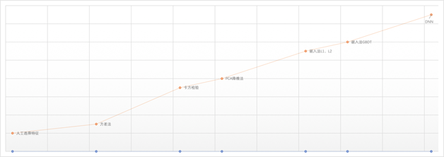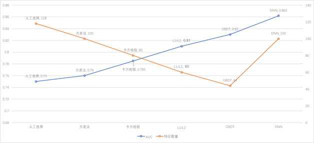 图2对比数据来自同一份数据集(特征选取与训练分开,各百万条样本)与同一组特征集合(118个原始特征),采用不同的特征选择方法对特征进行过滤、选择、提取。橘色曲线表示对原始特征进行特征选择后,不同特征选择方法保留的有效特征个数,如用GBDT进行特征选择后,仅仅留下44个有效特征。保留特征的个数主要取决于算法本身与业务人员的选择。如对于方差法、卡方检验等相关性排序法,需要业务人员和算法人员指定保留的特征个数;而像L1正则与GBDT,则完全由算法本身根据数据分布特点,来决定原始特征的去留。最后的DNN即深度学习,也是根据经验人为指定最后一层隐层的特征个数。蓝色曲线表示采用不同特征选择方法后,用另一份单独的数据集进行训练后的模型(LR模型)预测性能,我们这里用业界应用广泛的AUC(Area Under Curve)来衡量模型的有效性。方差法和卡方检验完全取决于特征本身及其与标签的相关性,因此提升幅度有限。正则化与GBDT等采用模型倒推的方法进行特征选取,因此预测性能有显著提升。深度学习能够在多个层次对特征进行抽象,最后一层隐层代表了特征的最高层次抽象,因此区分度最好。