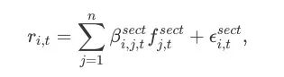 βi,j,tsect 表示t日,第j个sector因子对资产i产生的风险。factor exposure(也称factor loading)指的是因变量和潜在变量之间的关系,如对于资产i,如果第j个sector因子和它没关系,则βi,j,tsect=0;