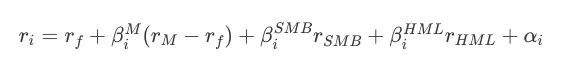 CAPM把投资组合的收益分解为市场收益和无风险资产预期收益两部分。这是个不存在于现实世界的朴素观点。事实上它从提出以来也经历了多次改进,如Fama-French三因子模型。后者把两个风险源扩展为三个风险源——市场、公司规模和公司价值。以下是它的表达式: