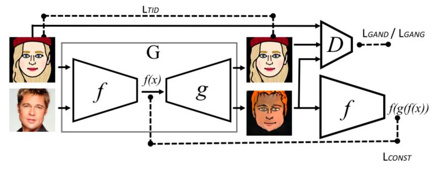 如上图所示,G 可以看作关于动漫图像的 AutoEncoder。G 需要满足的条件是,动漫头像经过 G 之后,基本保持不变。而真实图像经过 G 之后会被动漫化。