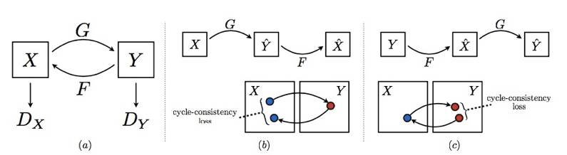 在上面的框架图中,G 和 F 是生成器,Dx 和 Dy 是判别器。G 和 F 可以分别看成 Autoencoder 中的 Encoder 和 Decoder,Encoder 将 X 所在的域中的图像翻译成 Y 所在域中的图像,Decoder 反之。而 Loss 除了传统 GAN 的散度 loss 之外,还应该加入重构误差。