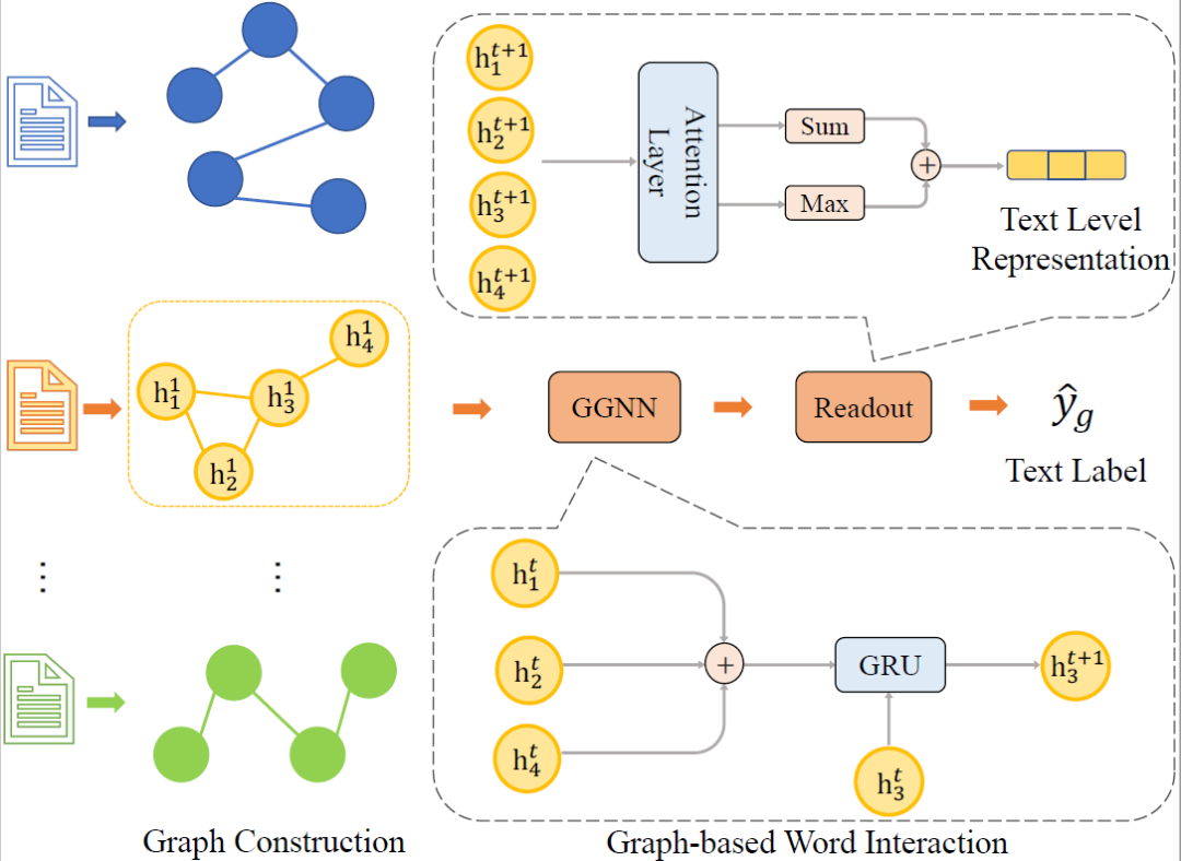 该工作以单词为节点、单词间的共现关系为边,将每个文档构建为拥有自身结构的图,将文本分类任务转化为图分类任务。通过应用图神经网络模型,单词可聚合学习所有关联单词的表示,同时也可捕获中长距离的上下文关系。最后使用最大池化加平均池化的方法,将所有单词聚合为该文本的表示,进而得到其分类标签。