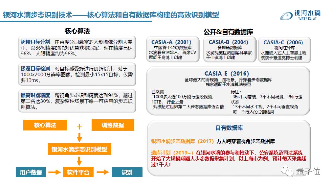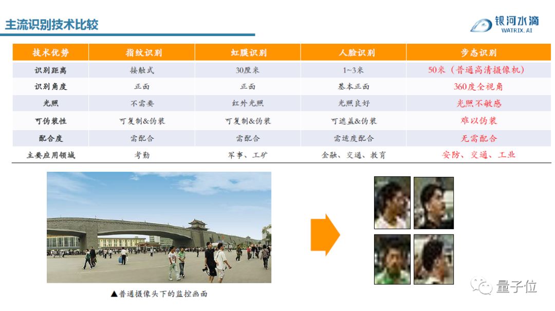 步态识别,水滴现在能够做到的最远识别距离是50米,而且是360度全视角识别,不管人是从什么方向走过来,都可以识别;即使光照有变化,或者说穿的衣服有变化,甚至把面部挡住都没有关系,都可以被识别。另外步态识别也不需要被识别人的主动配合,用户体验更加友好。