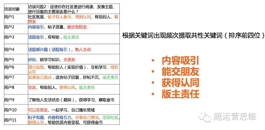在访谈结果分析方面,一般采取关键词提炼法,即针对每个用户对每个问题的反馈进行关键词提炼,然后对所有访谈对象反馈出的共性关键词进行汇总,具体思路如下: