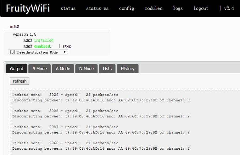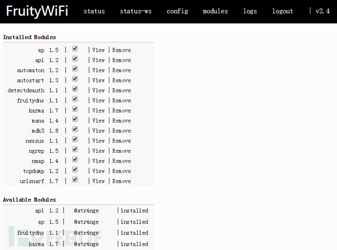 modules:这里列出了许多可用的插件,可供下载使用。树莓派3B自带的无线网卡是不支持monitor模式的,如果想使用mdk3这种需将网卡设置为monitor模式的模块,需外置个支持monitor模式的USB无线网卡。