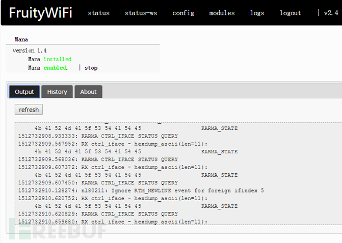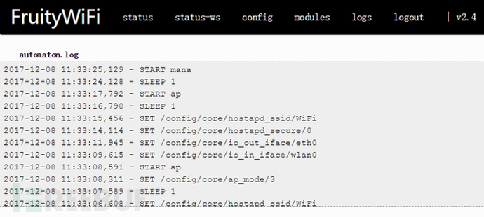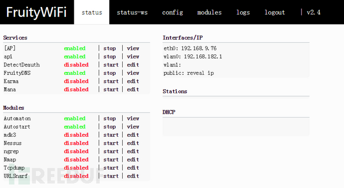 进入FruityWifi的web管理界面后可以看到目录上的几个选项。