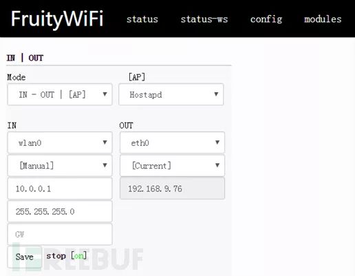 config:这里能够设置软AP,可以看到很多模式,能够灵活的对接口进行组合。IN口为内网接口,一般设置为能够提供软AP服务的那个网口。OUT口为外网接口,设置为连上互联网的网络接口。配置好IN口和OUT口的地址后,点击save保存。AP模式最初有两个可以提供选择,分别是Hostpad和Airmon-ng,如果安装了karma和mana后,会多出两个模式来,会增加Hostapd-Mana和Hostapd-Karma两个模式,当使用这两个模块时,配置对应的AP模式即可。当无线网卡使用Realtek芯片时,只能选择Airmon-ng模式,并且只有使用 atheros芯片的无线网卡才支持karma和mana攻击。下载好AP模块后,就能够很好的管理和启动热点。